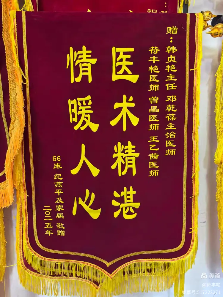 一个平凡却又特殊的日子。当我从患者手中接过这面沉甸甸的锦旗时,内心的激动与感动无以言表。‘医术精湛,情暖人心’——锦旗上的八个字,像一束光,瞬间照亮了我工作当中略显忙碌和疲惫的日常。这不仅是一份荣誉,更是一份沉甸甸的信任与嘱托。