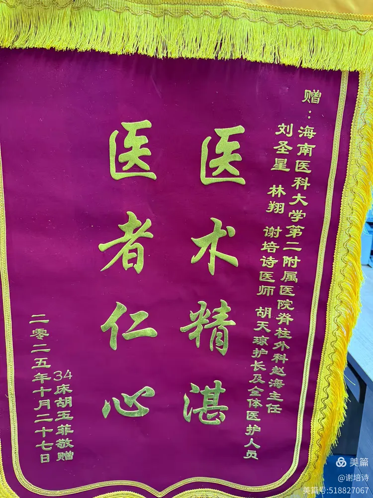 这面锦旗,是对赵海主任、刘圣星副主任医师、林翔医师、谢培诗医师、胡天琼护士长及脊柱外科全体医护人员的崇高致敬。它见证的,不仅是一次手术的成功,更是一段关于生命重塑、关于信任托付、关于医患同心的温暖旅程。