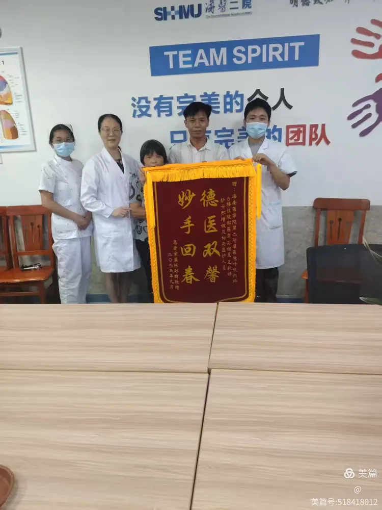在这次特别的旅程中,我有幸见证了一幕温馨又充满敬意的画面。在海南医学院第二附属医院的一天,呼吸与危重症医学科孙铭呈住院医师收到了一面锦旗,这不仅是一份荣誉,更是医患之间深厚情感的体现。