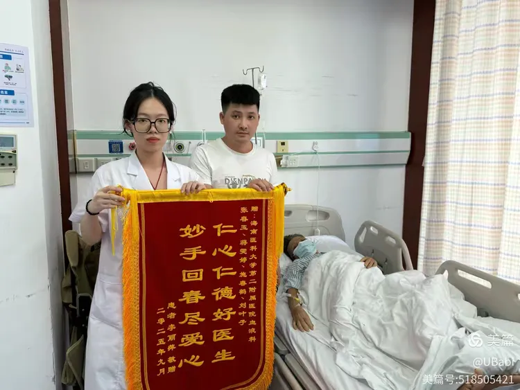 今天,患者经过治疗病情已达到缓解。而她的家属带着锦旗来到医院,那锦旗上的每一个字都饱含着深深的谢意。这不仅是对医护团队工作的认可,更是对他们继续前行的激励。医护团队深知,在这条救死扶伤的道路上,还有无数的挑战等待着他们,但只要能看到患者重燃希望,一切的付出都是值得的。患者和家属特别感谢 2024 级住院医师蒋雯婷的辛勤付出和无私奉献,她的专业技能和敬业精神为患者的康复做出了重要贡献。