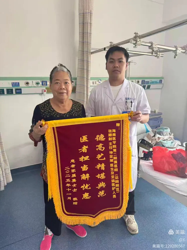 今日,一面绣着“德高艺精堪典范,医者担当解忧患”的鲜红锦旗,悄然点亮了海南医科大学第二附属医院脊柱外科的医生办公室,也温暖了整个冬日的行医时光。这份来自患者及家属的沉甸甸的心意,让我满心感动,更满怀感恩。