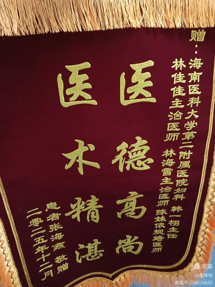 诊室的荣誉角里,新添的那面锦旗,红得格外动人,“医德高尚,医术精湛”的字样,是一位瘢痕处妊娠患者,送给妇科团队与我的谢意,这背后,是一场关于精准与温度的救治,也是我作为妇科规培生,难忘的成长印记。