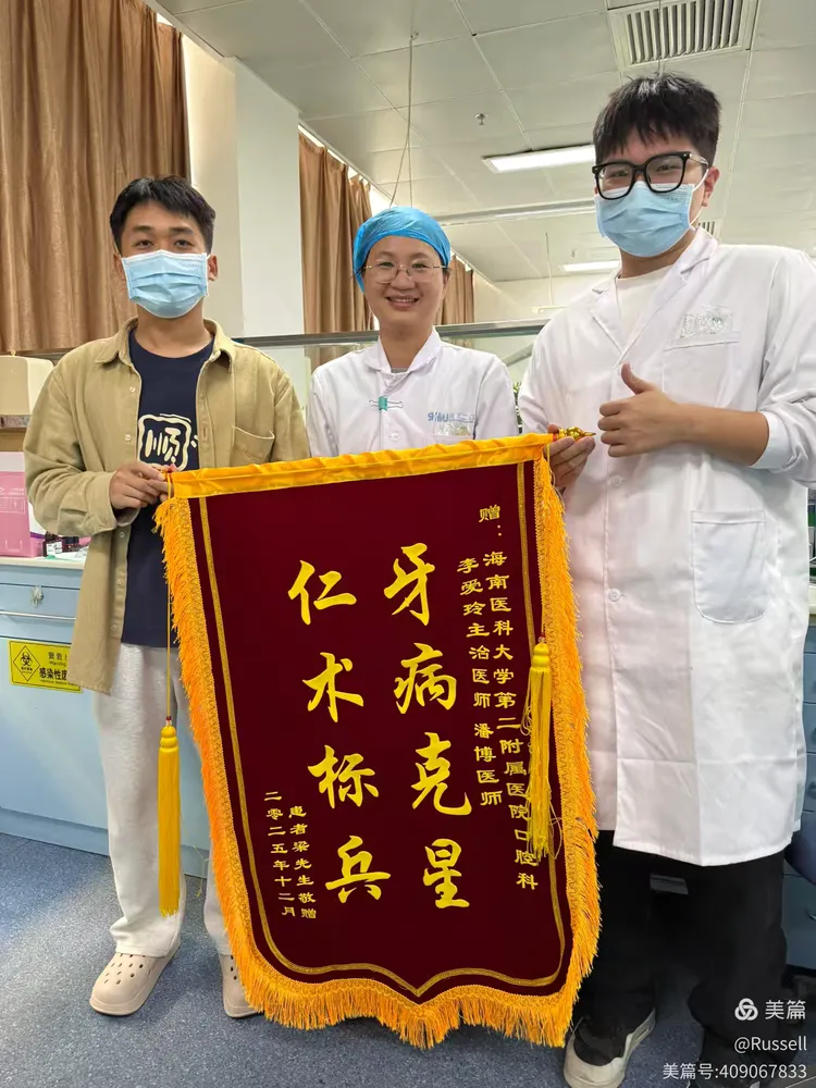 我是海南医科大学第二附院医院的24级口腔科规培生潘博,作为一名还在学习与积累中的口腔科规培医生,今天,我收到了一份从未奢望过的、沉甸甸的礼物——一面来自患者的锦旗。展开它时,手有些微微颤抖,心中满是难以置信的感动,与深深的惶恐。这份肯定,对我而言,重若千钧。